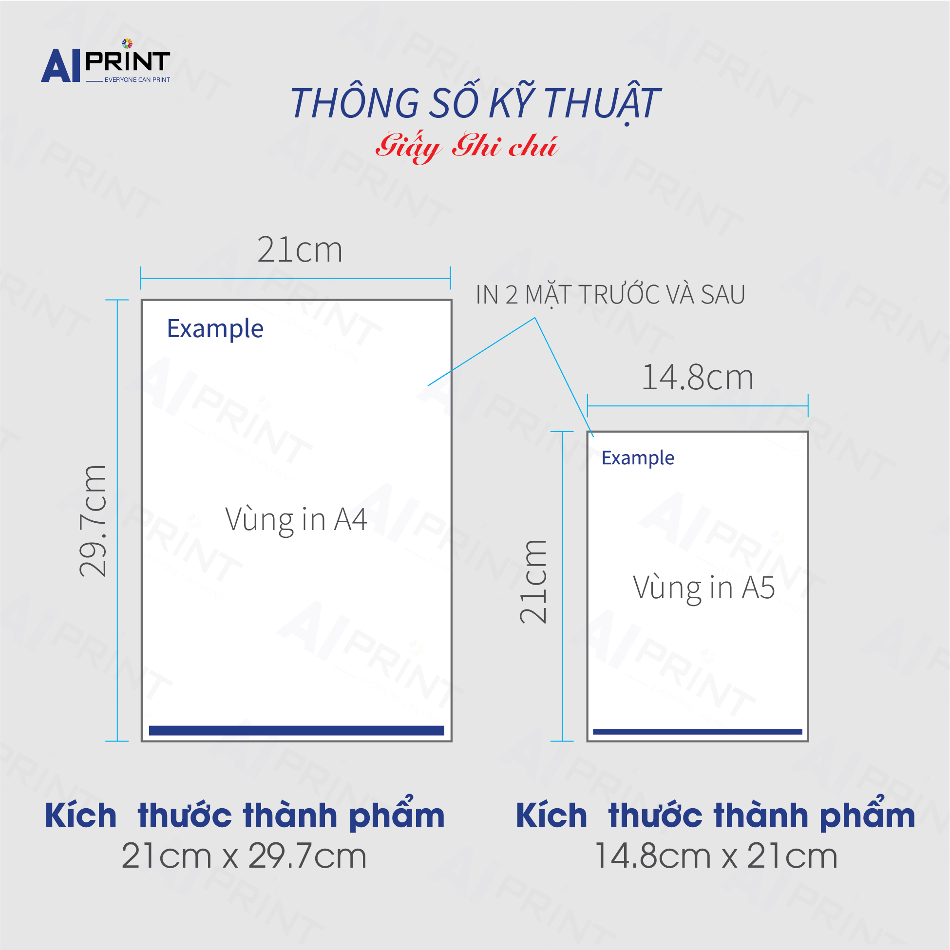 Giấy ghi chú có kích thước thông dụng như A5, A6. Ngoài ra có thể tuỳ chỉnh kích thước giấy ghi chú theo file in của bạn.