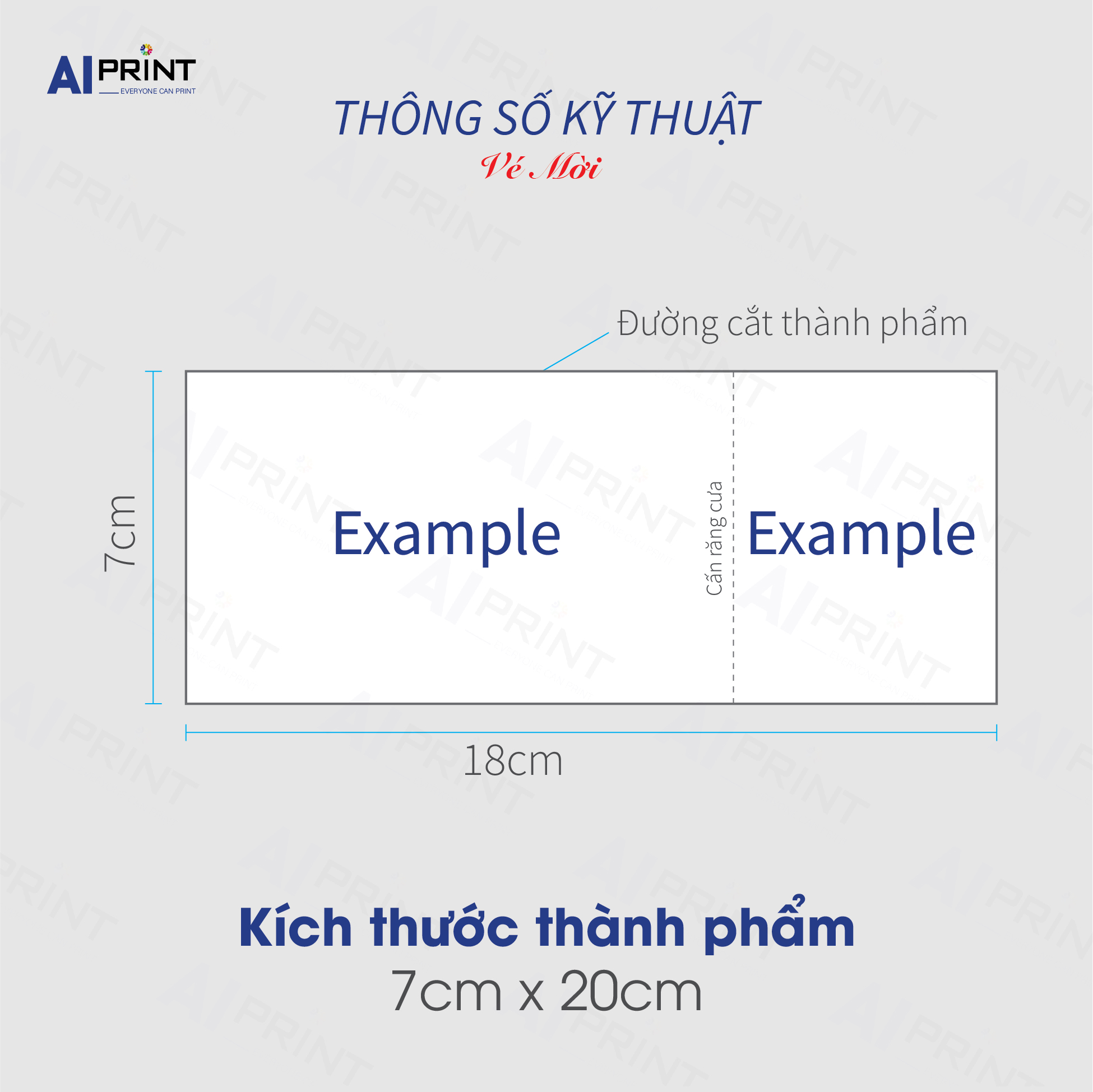 - Kích thước in vé mời đóng cuốn thành phẩm là 7x18cm, kích thước thiết kế 6.6x19.6cm